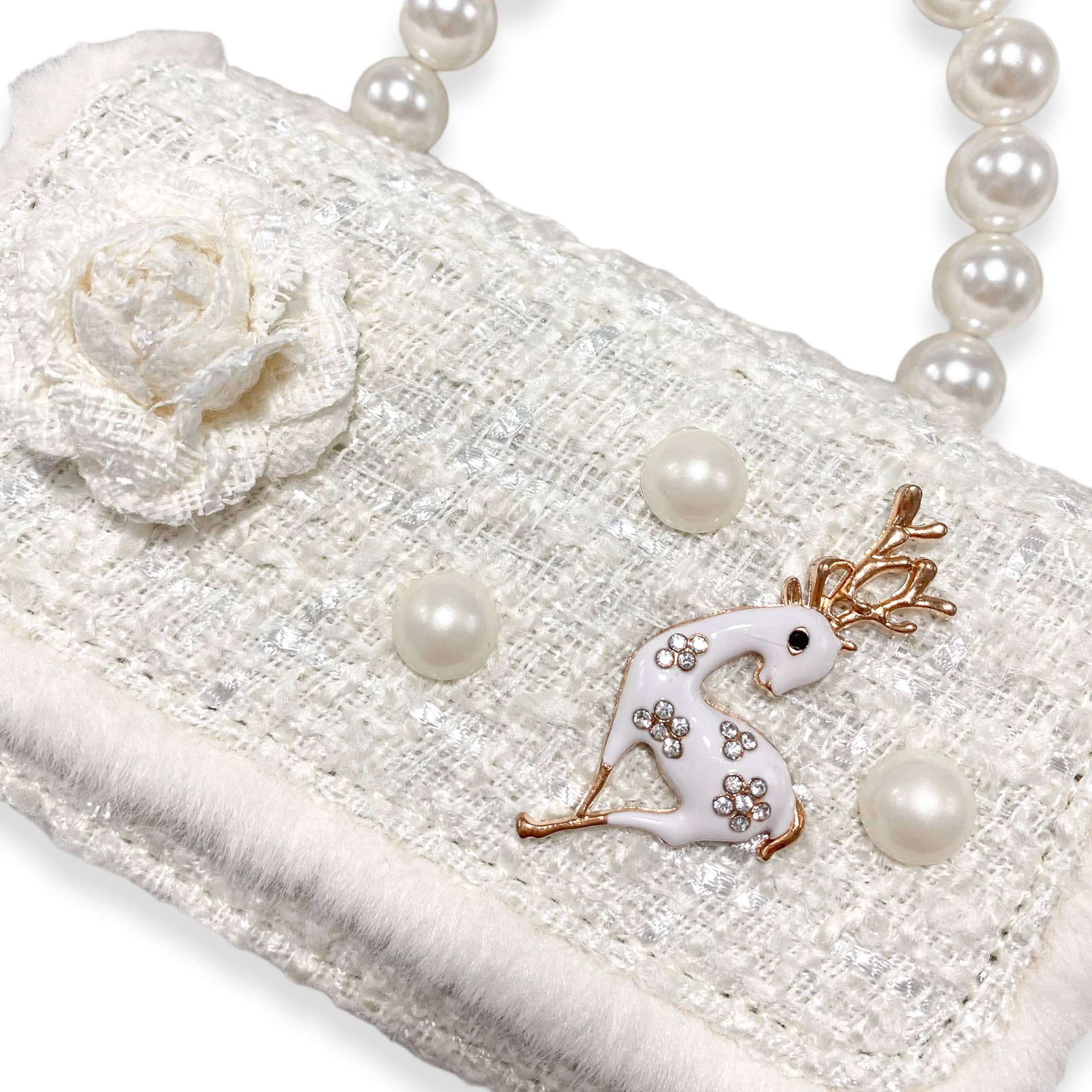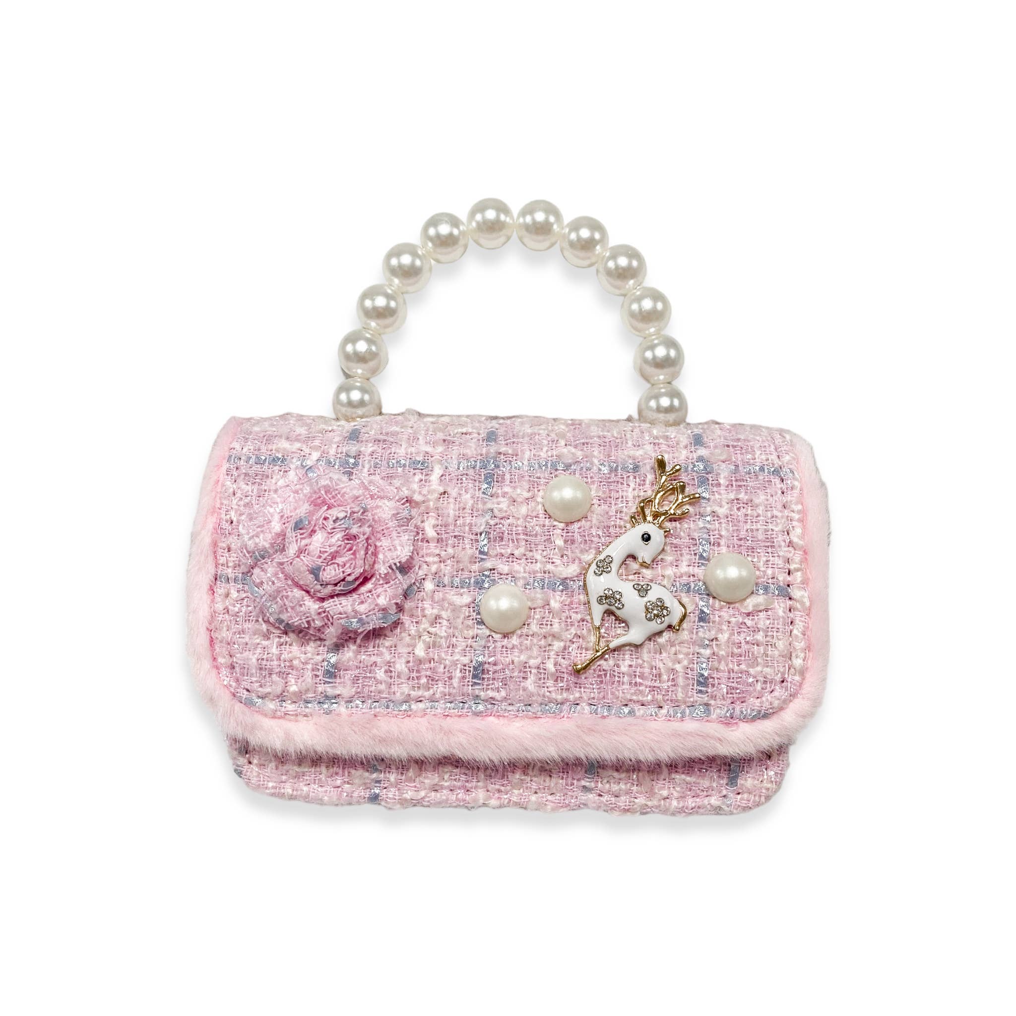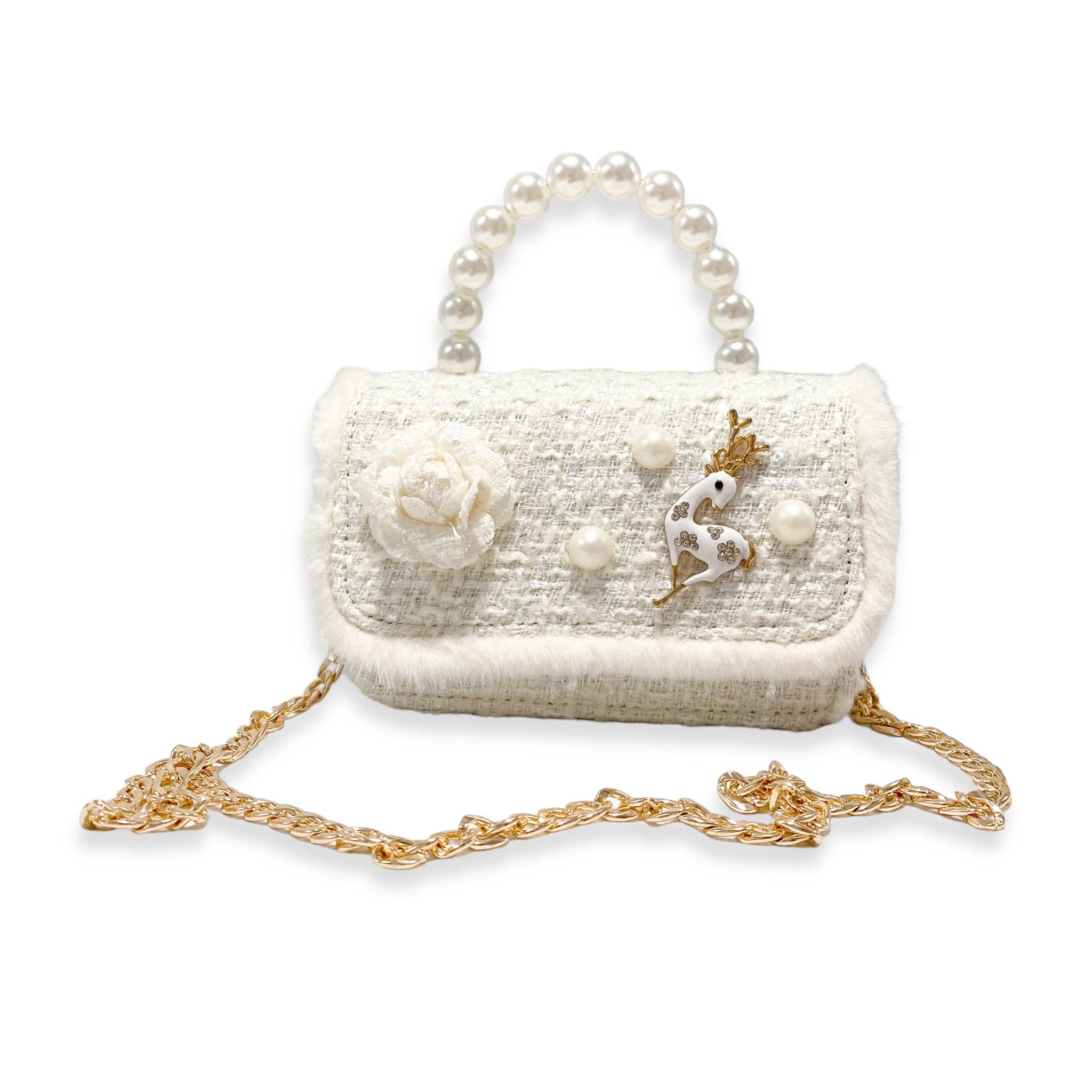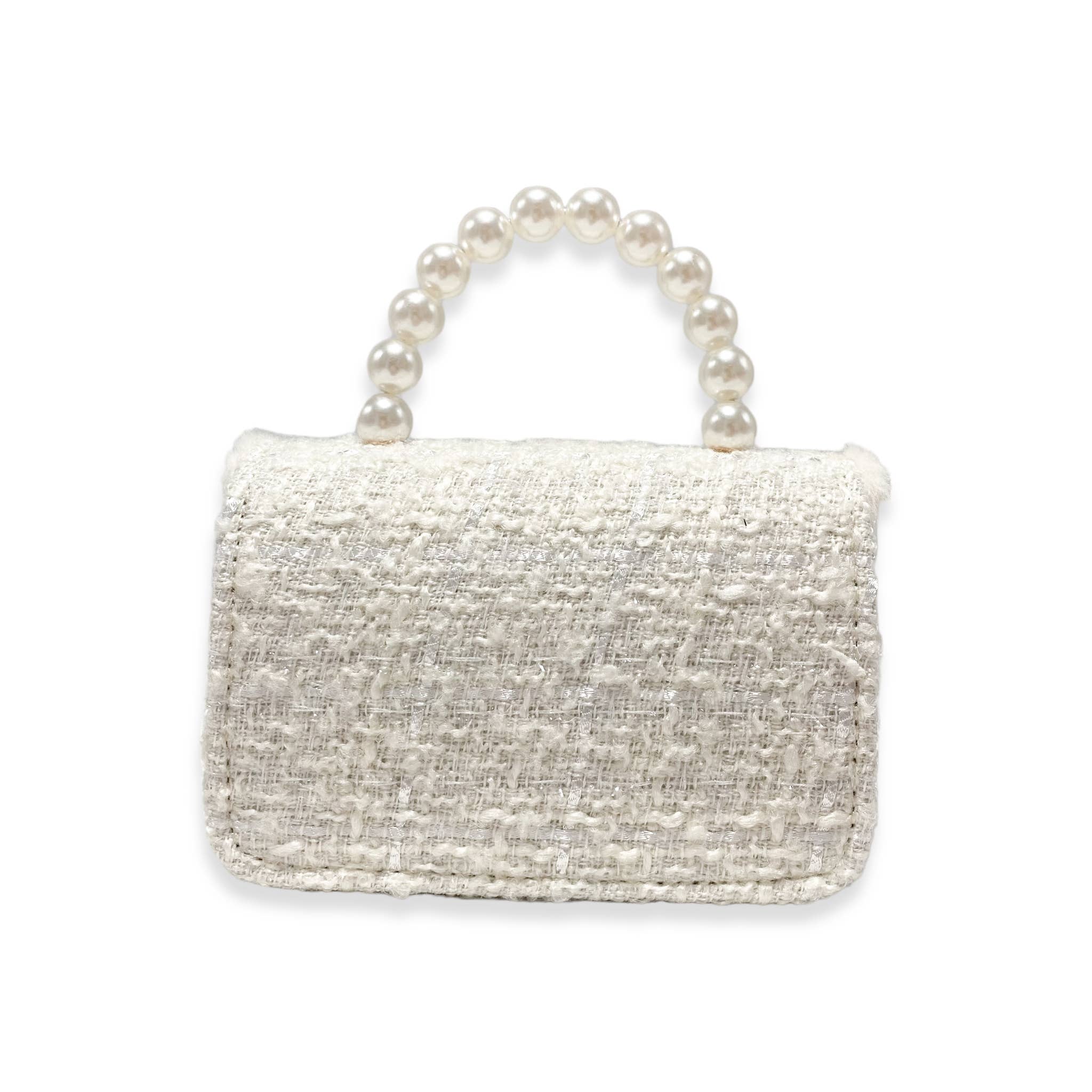 This elegant tweed purse is a true classic! The cute charms on the front lean into an elevated design that match perfectly with the pearl handle. A detachable gold chain is included as well! Dimension: 5-1/2" Length x 3-3/4" Height x 2-1/4" Width